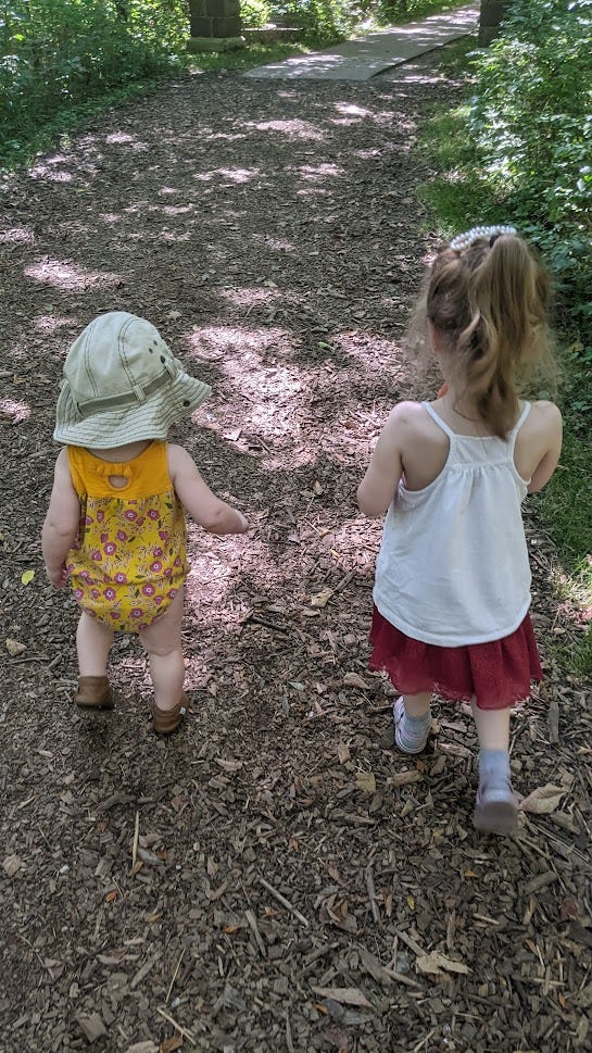 Last week, the girls and I went on a adventure together at the local arboretum. There are over 300 acres to explore and it was so fun to see the girls walk around together, noticing different flowers, quietly watching the birds, and discovering a deer a few feet off the path.